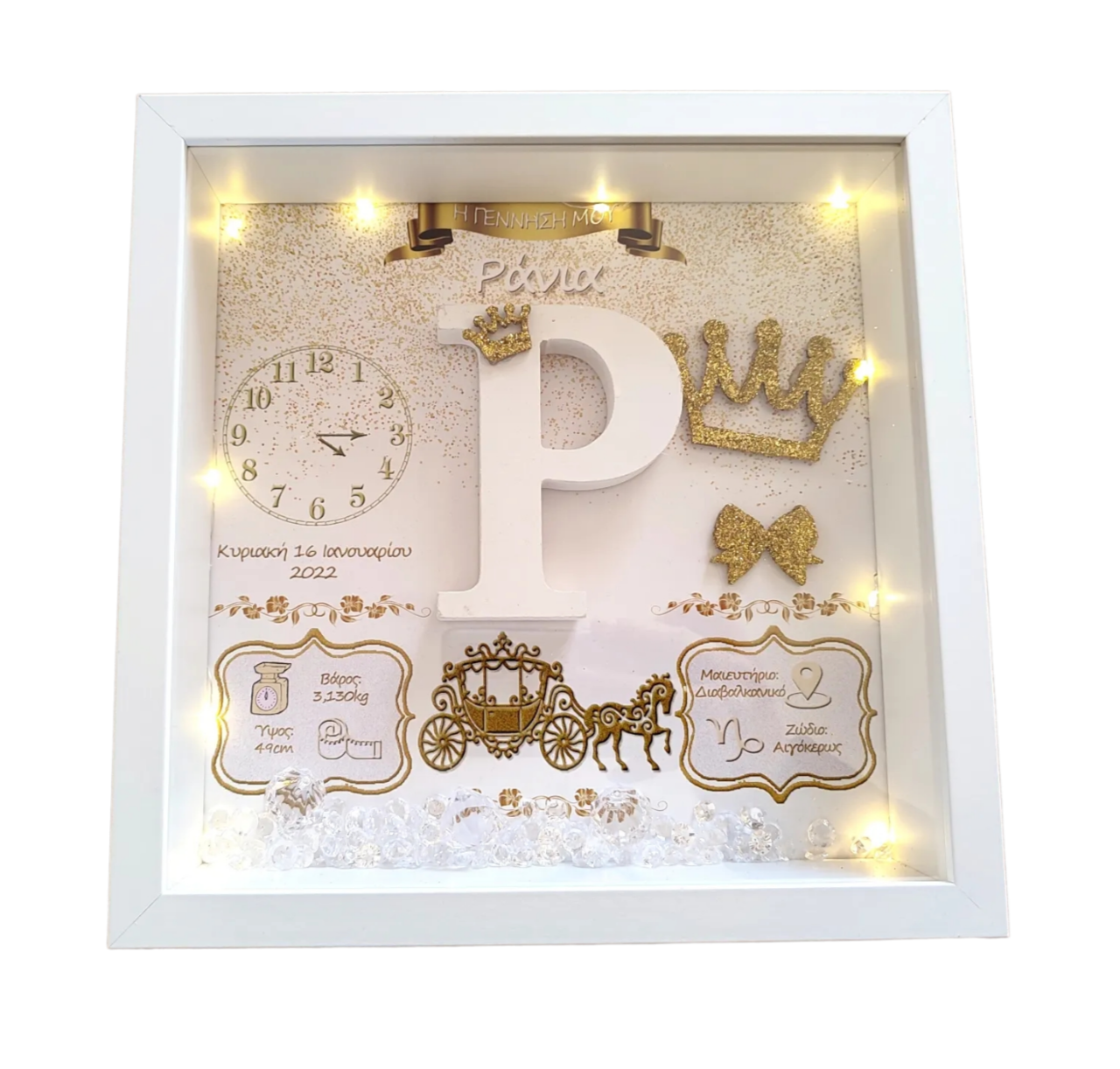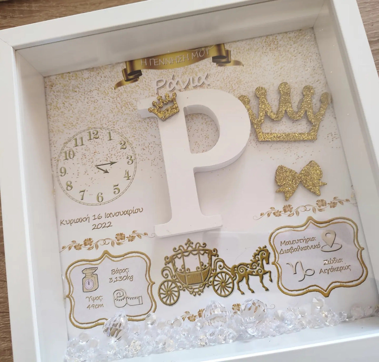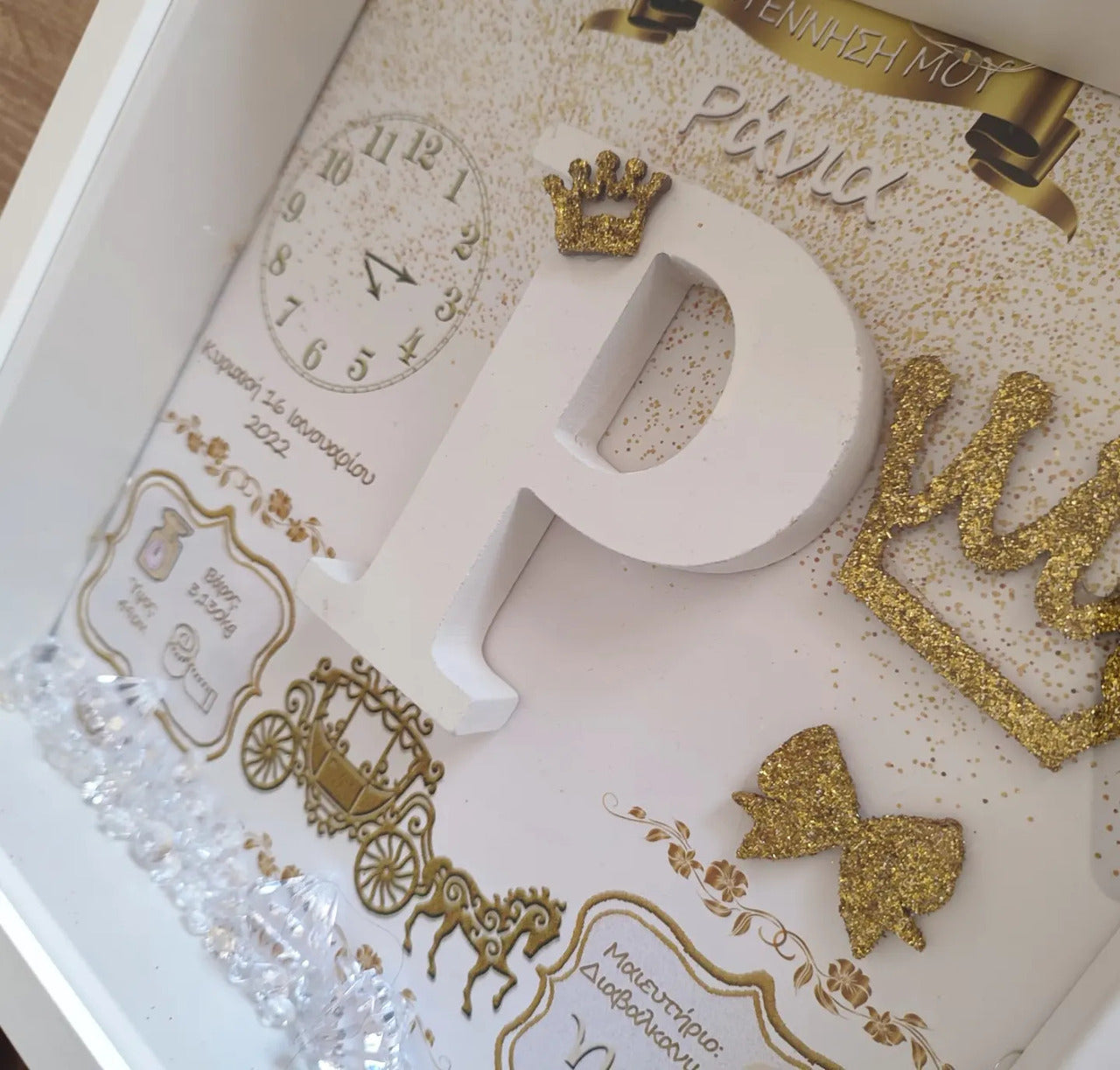 Καδράκι εξωτερικών διαστάσεων 27x27x6cm με πρόσοψη Plexiglass στο εσωτερικό έχει διακοσμηθεί με κορώνες σε δύο μεγέθη με γκλίτερ και το αρχικό που μωρού!