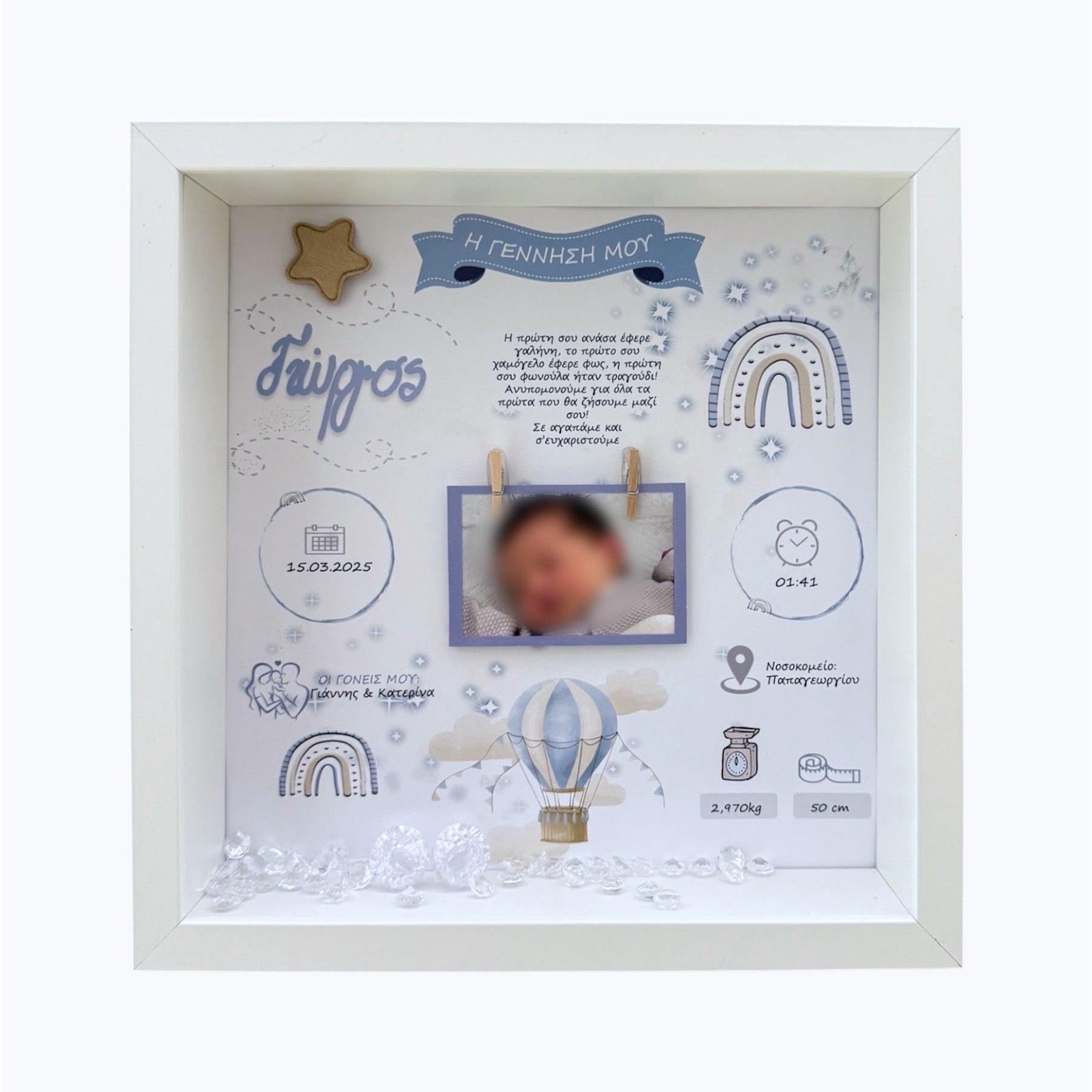 Ένα ξεχωριστό αναμνηστικό καδράκι με θέμα αερόστατο και μποχο ουρανιο τόξο αφιερωμένο στην πιο όμορφη αρχή: τη γέννηση του μωρού σας.