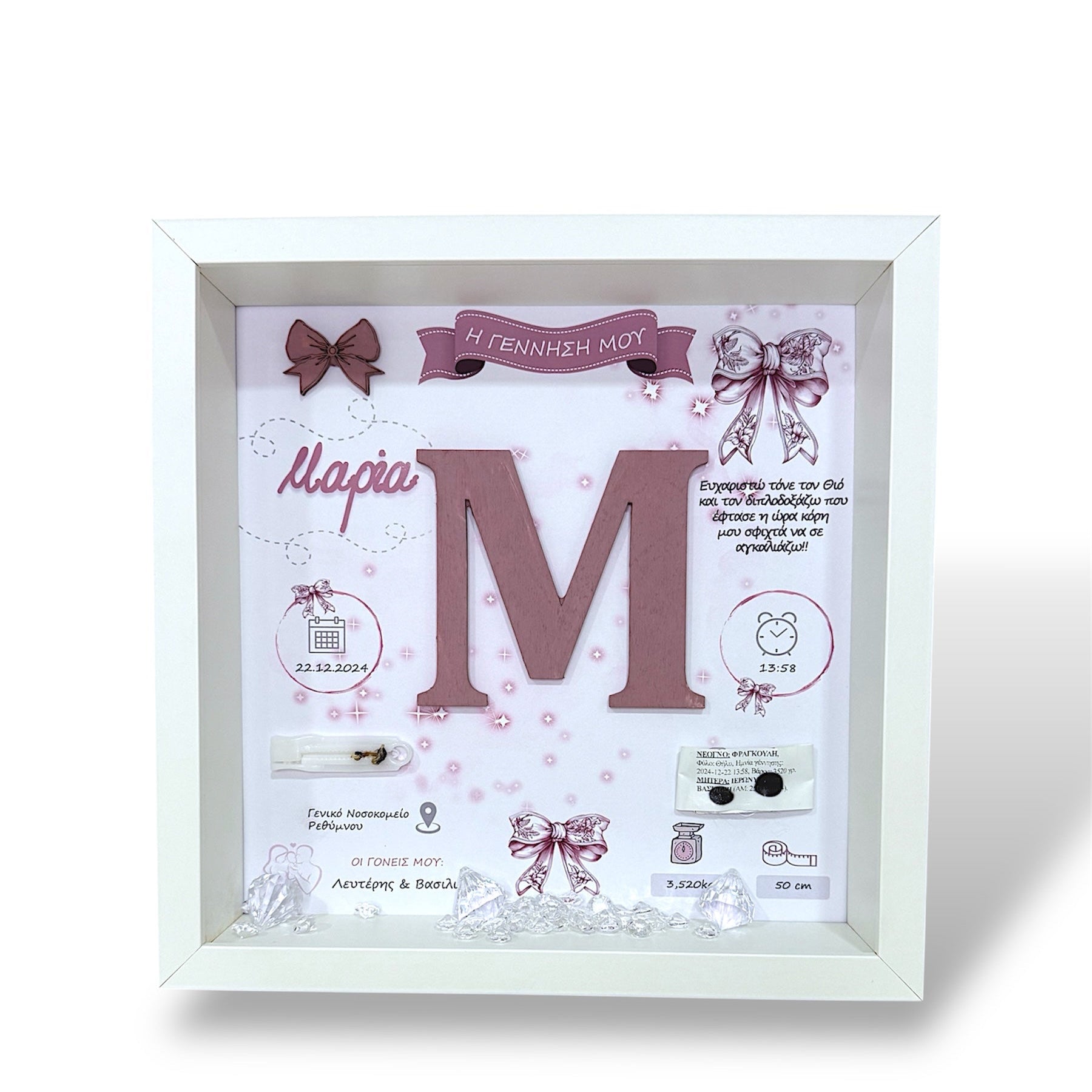 Με διαστάσεις 27×27x6cm και πρόσοψη από plexiglass, το καδράκι προστατεύει και αναδεικνύει μοναδικά αυτά τα πρώτα ενθύμια ζωής.